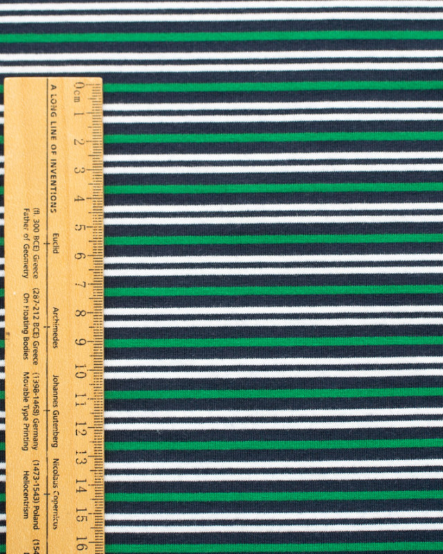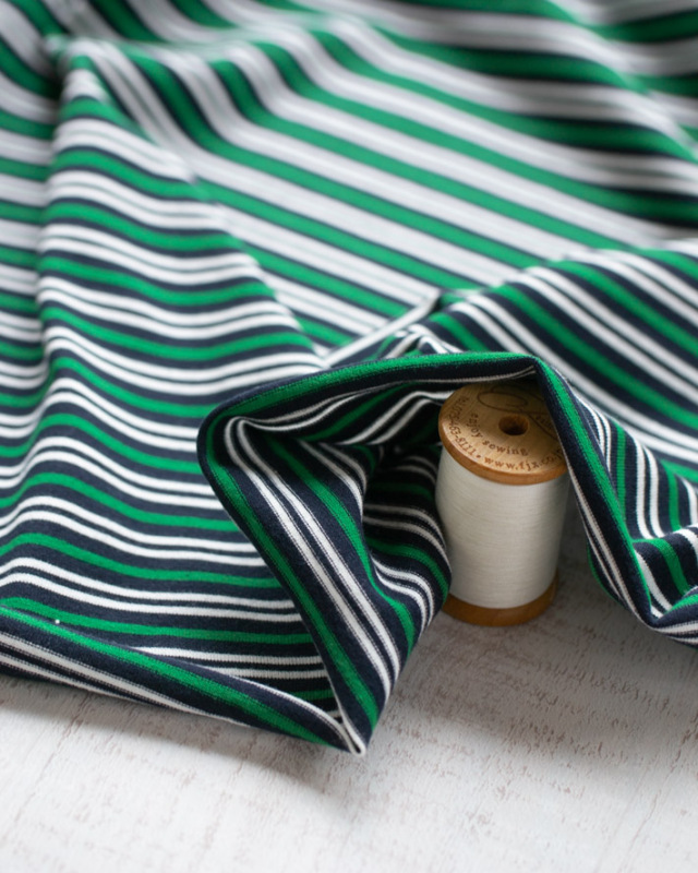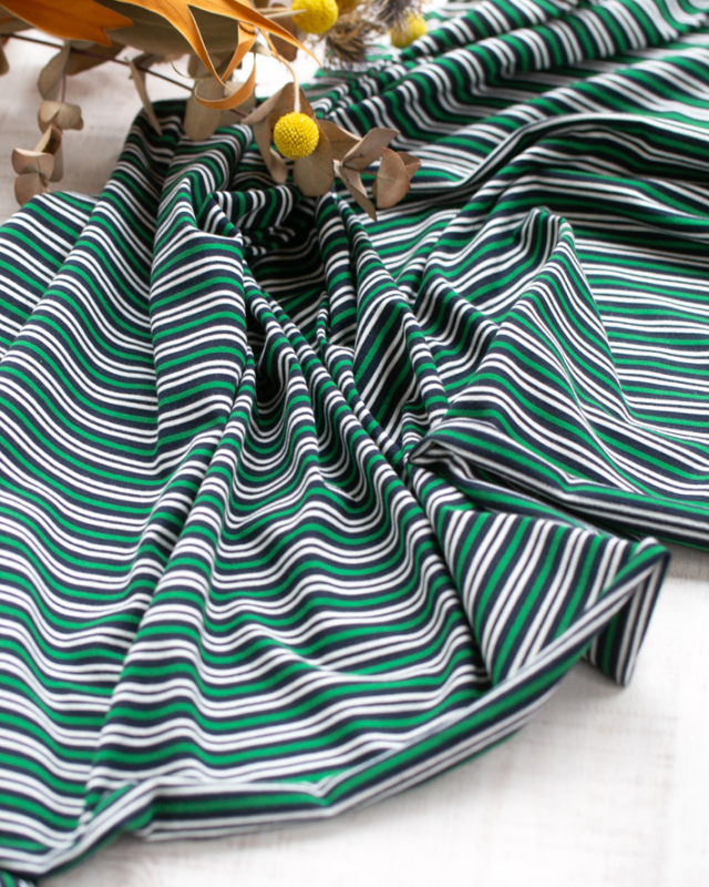| 品名 | 【ニット】肌ざわりハナマル♪ほどよい厚みのランダムボーダー天竺ニット(グリーン×ネイビー) |