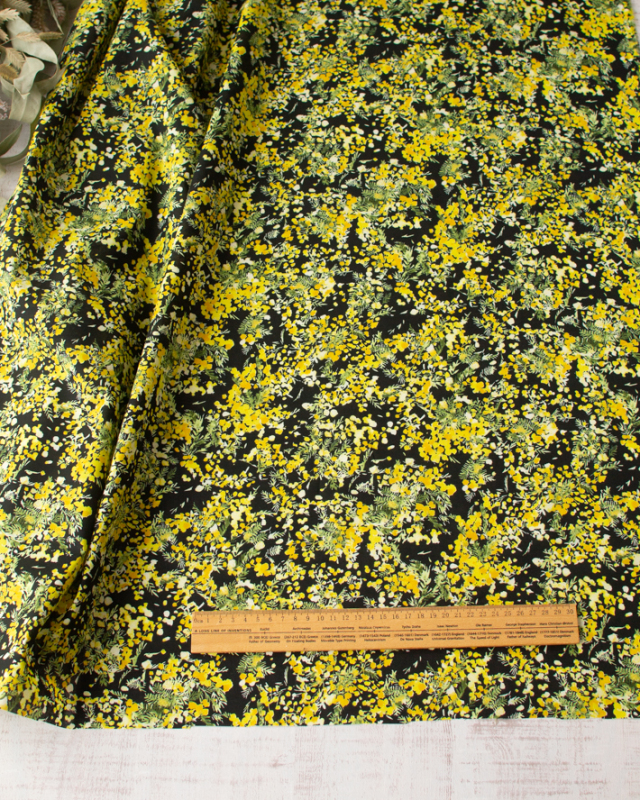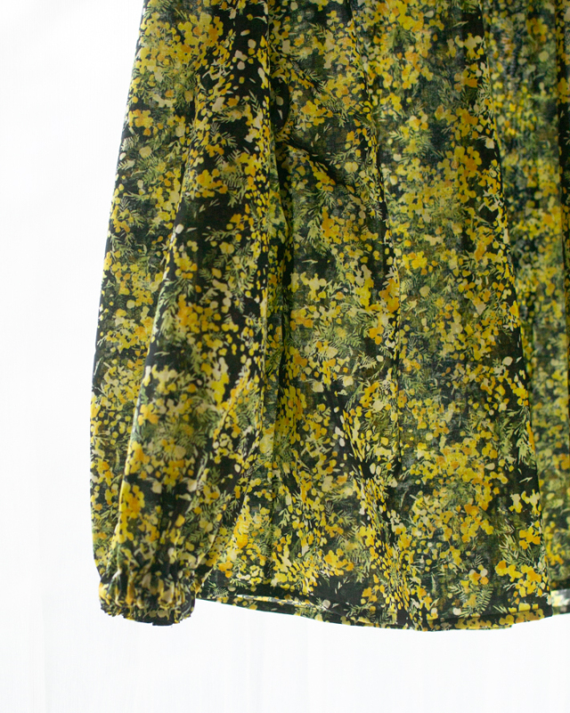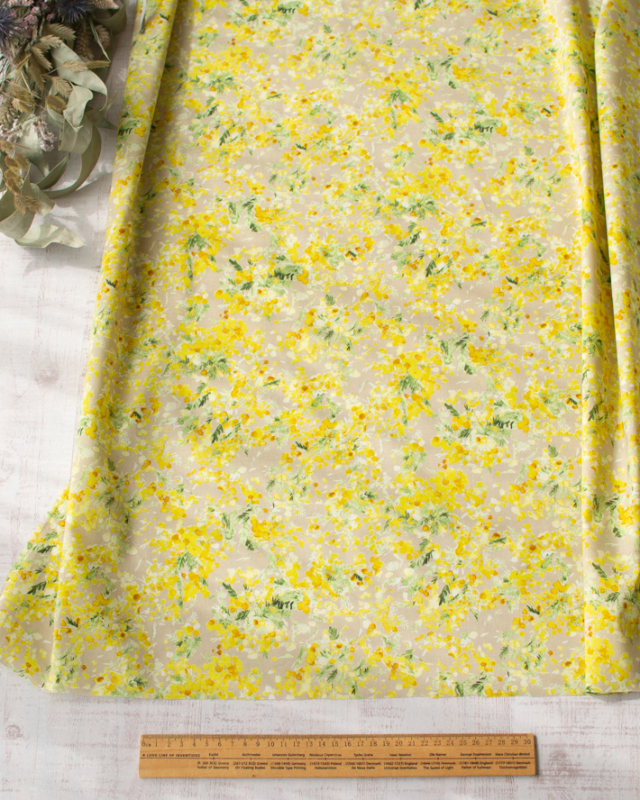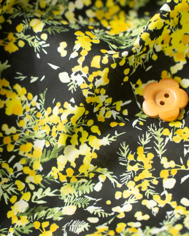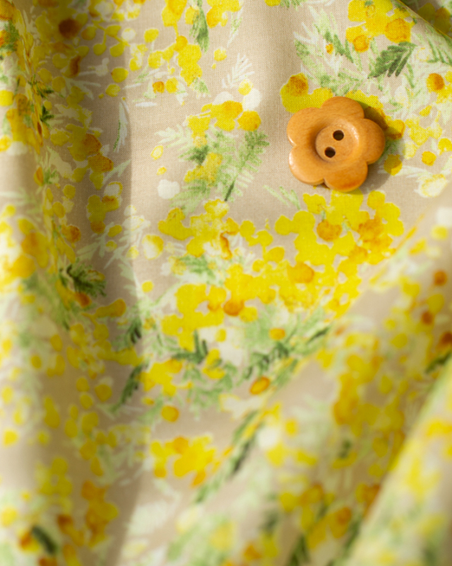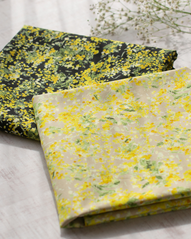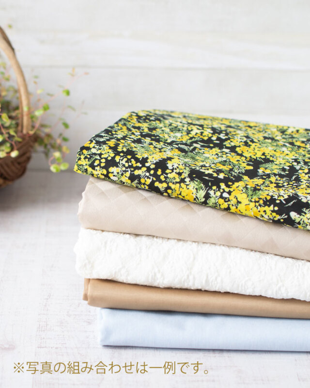 ぱっと目をひくミモザ柄がカワイイ、薄手のローン生地です。ふんわり軽い風合いなので、ギャザーを寄せたデザインとも相性◎。軽やかなブラウスやスカート、ワンピースにすると、春らしいやさしい雰囲気に仕上がります。
