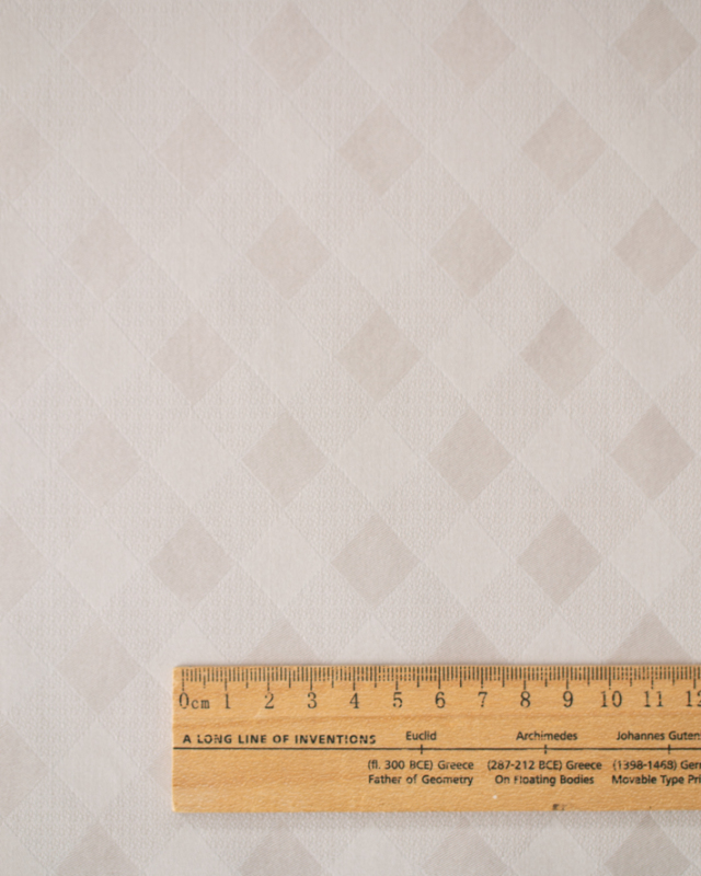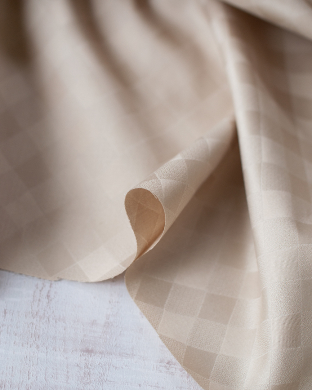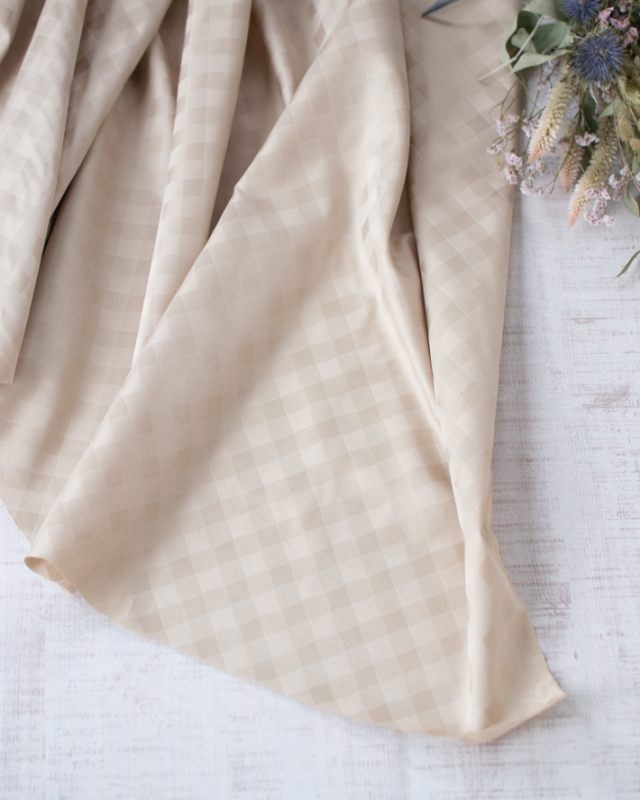 ほんのり光沢のある上品な綿サテンです。アーガイルチェックの柄がジャガードでさりげなく浮かび、光の当たり方によって柄がきらめいたように見えるのが魅力。カラーはベージュで落ち着きがあり、きれいめにもカジュアルにも合わせやすいので、パンツやシャツ、スカート、ワンピースなど幅広いアイテムにおすすめです。