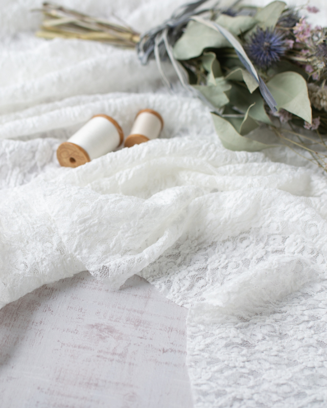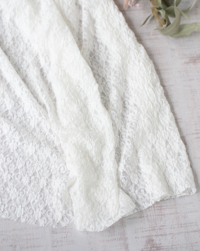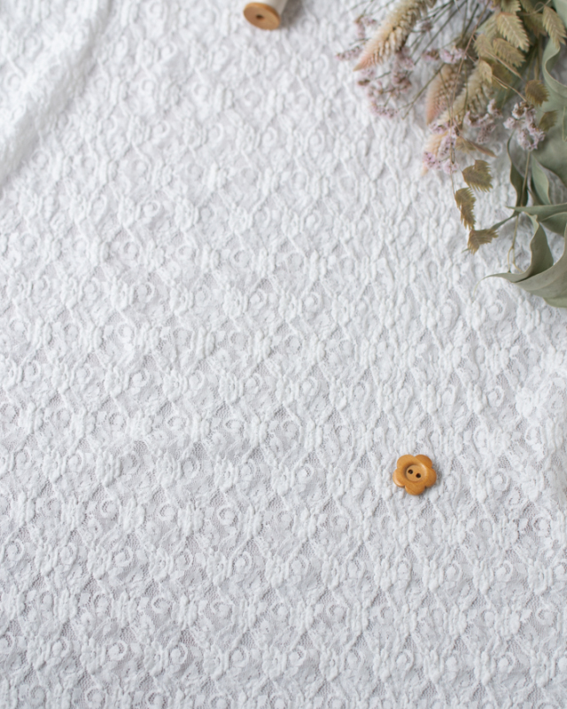 ふんわりやわらかな、小さな花模様のレースニット。ぽこぽこと立体感があり、オフホワイトのやさしい雰囲気で春らしさを楽しめます。横方向にやわらかく伸びるので着心地も◎。Tシャツの上に重ねて着たり、軽い羽織りやプルオーバーにするのがおすすめです。