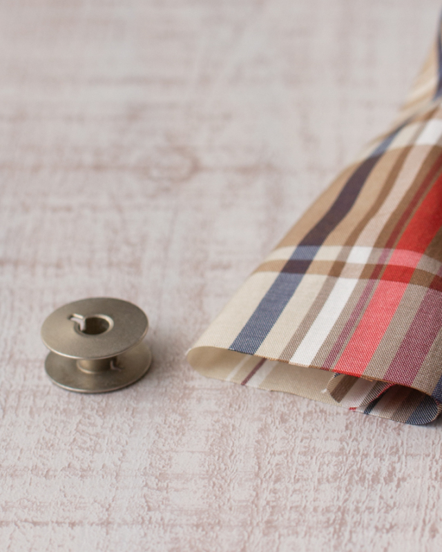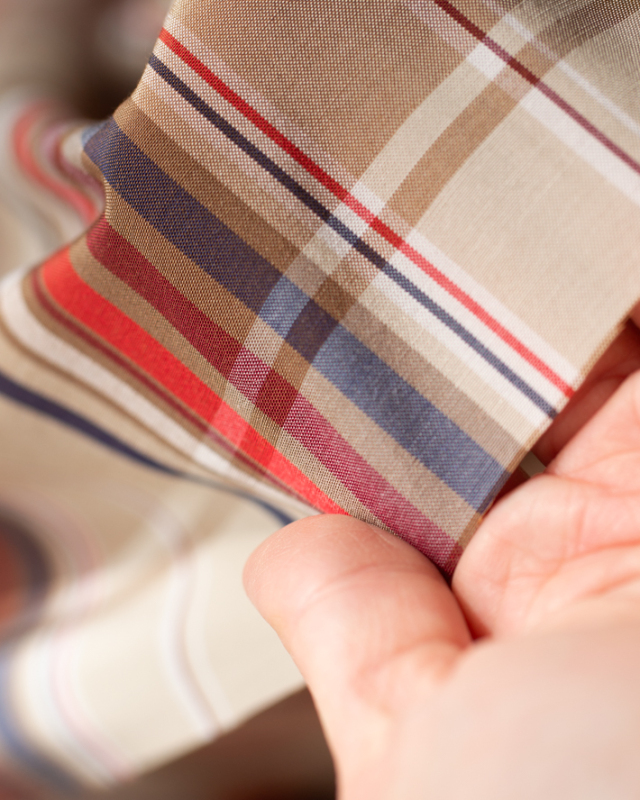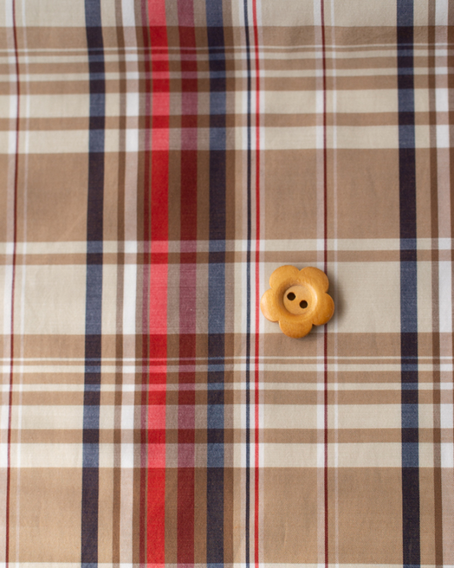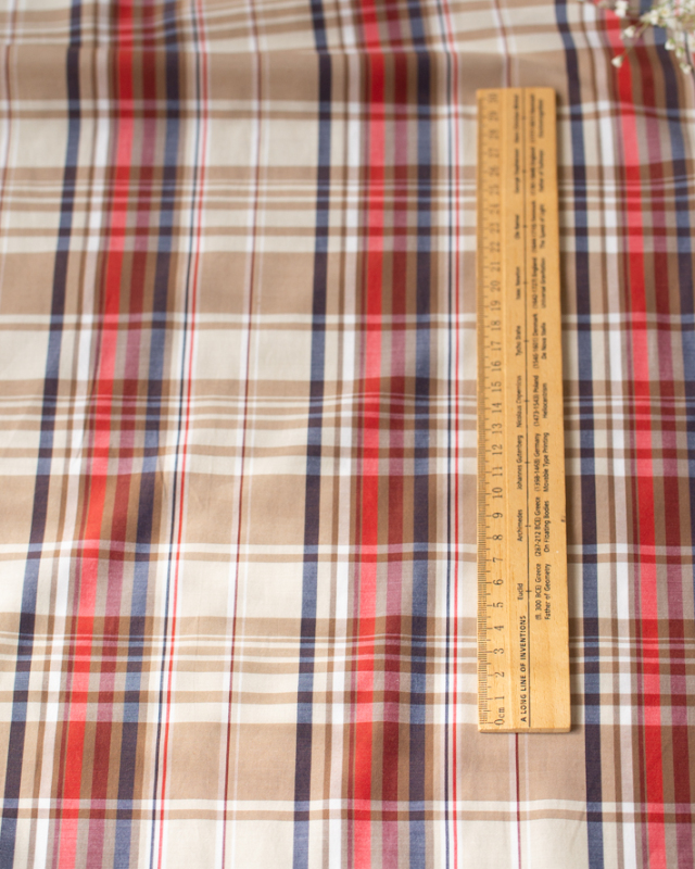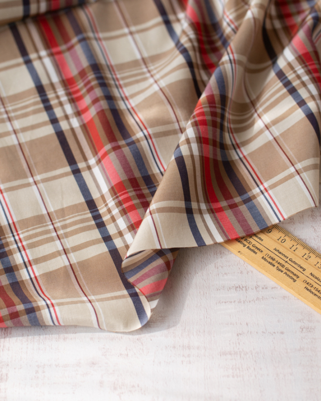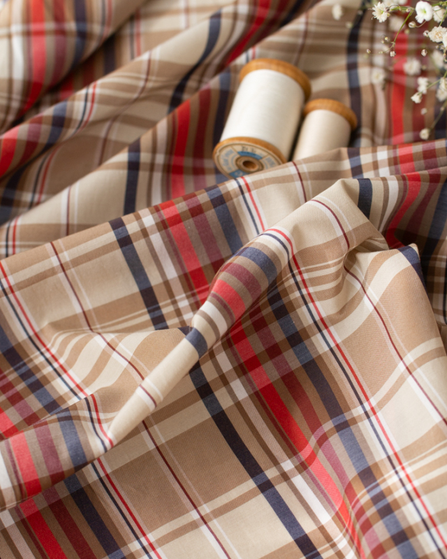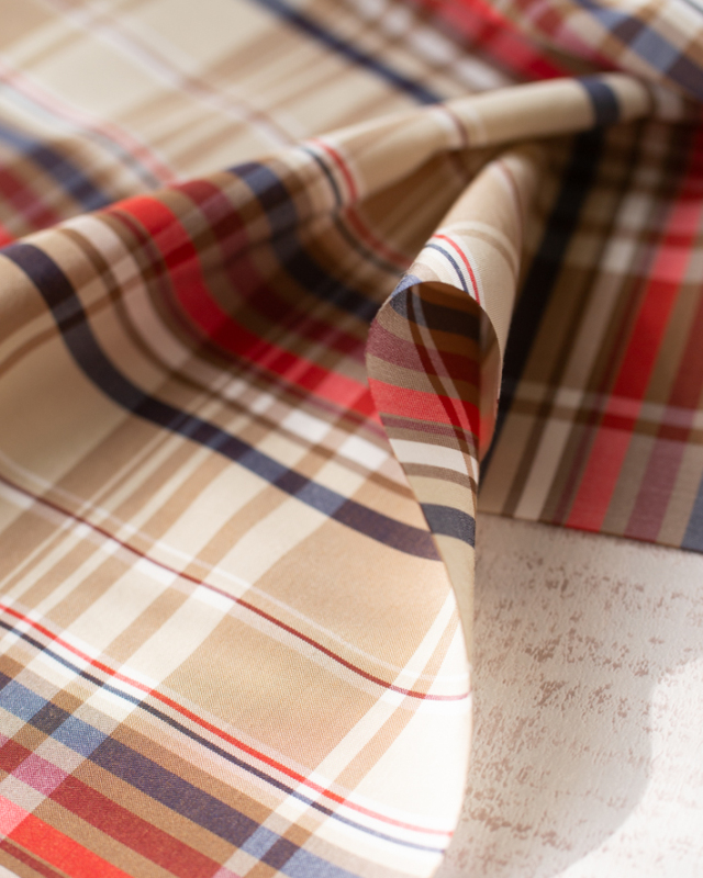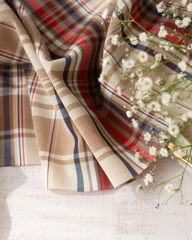 ベージュをベースに、オレンジ・ネイビー・ブラウンのラインが入った、落ち着いたチェック柄です。
