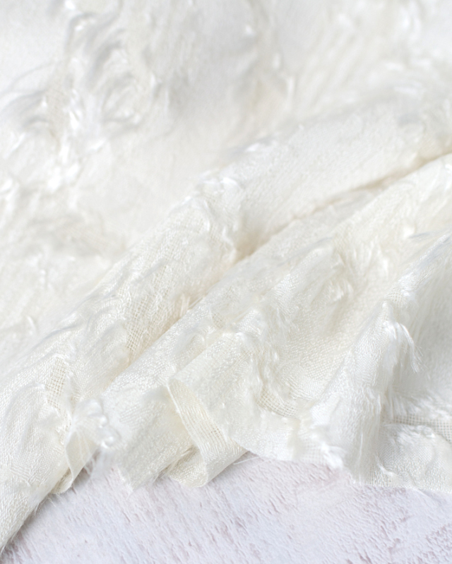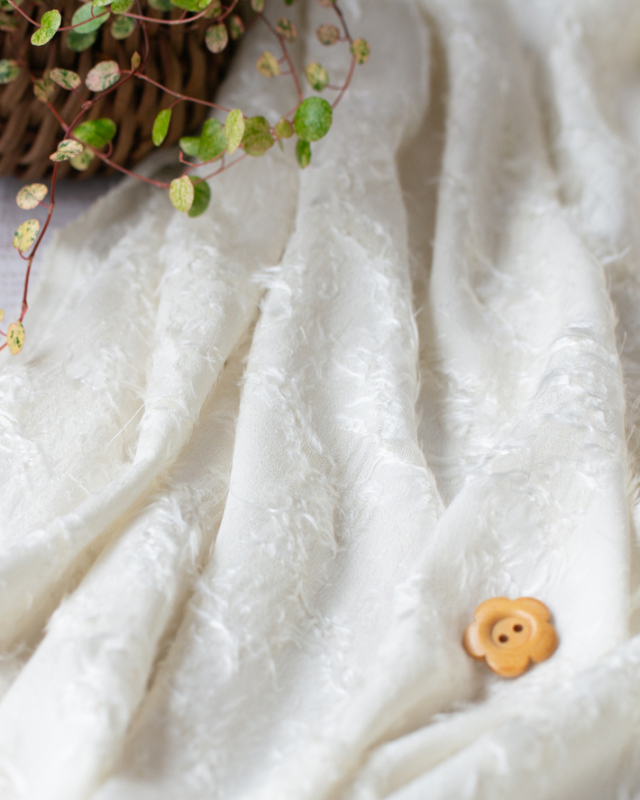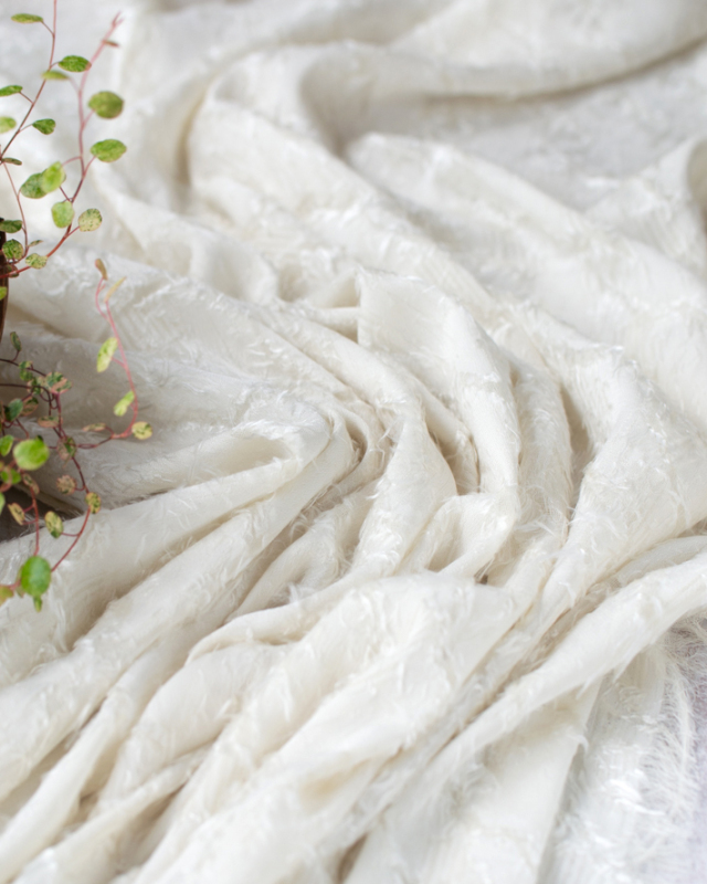 表面には、羽のように“ふさふさ”した糸がところどころに入っていて、光の当たり方で表情が変わります。