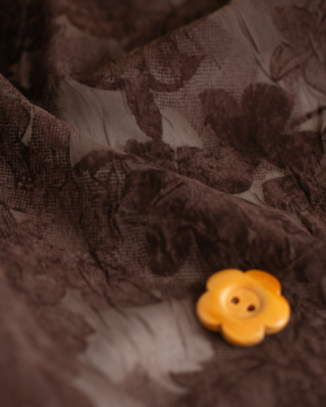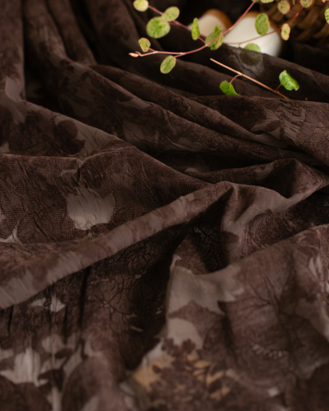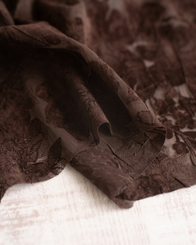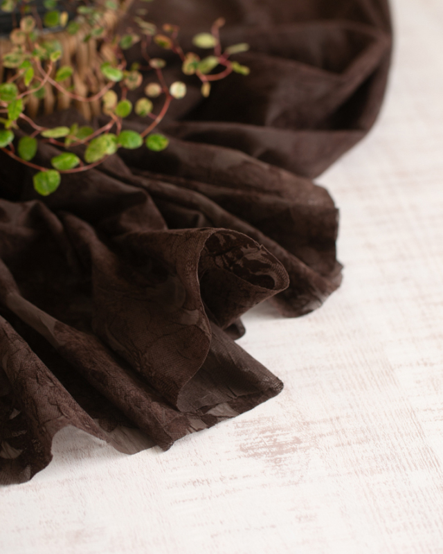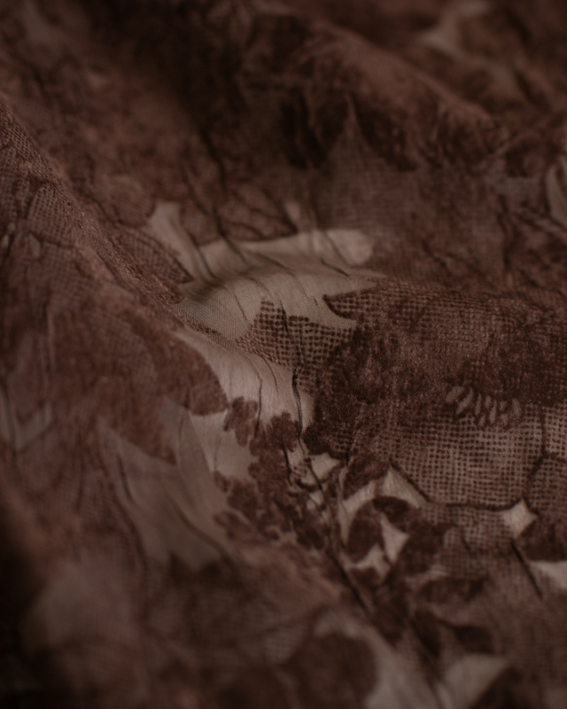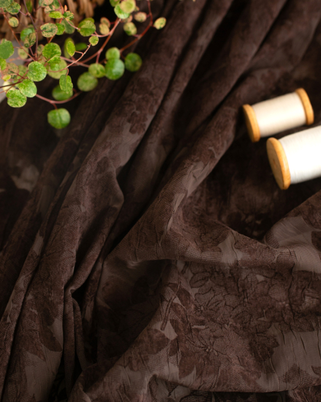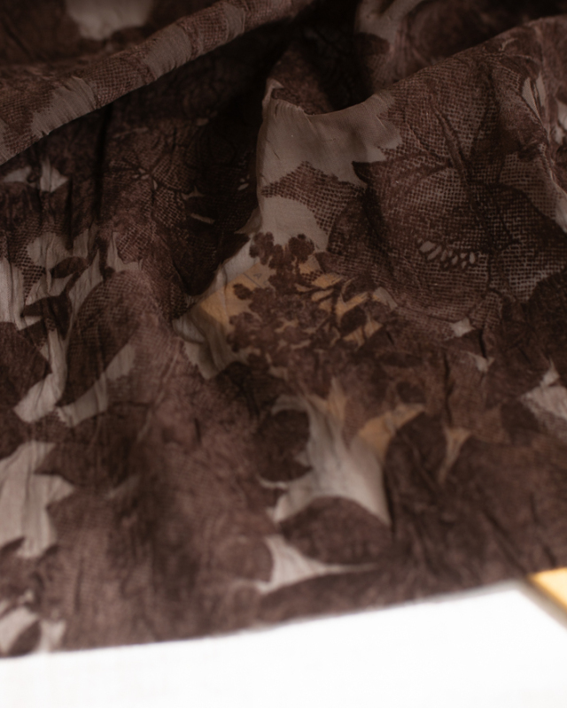 薄手でふんわり透け感のある生地に、大きめの花柄がプリントされた上品な一枚です。ほんのりシワ感があり、シンプルに仕立てても華やかに見えます。色はチョコレートのような深いブラウンです。