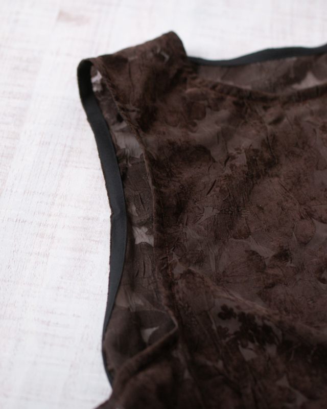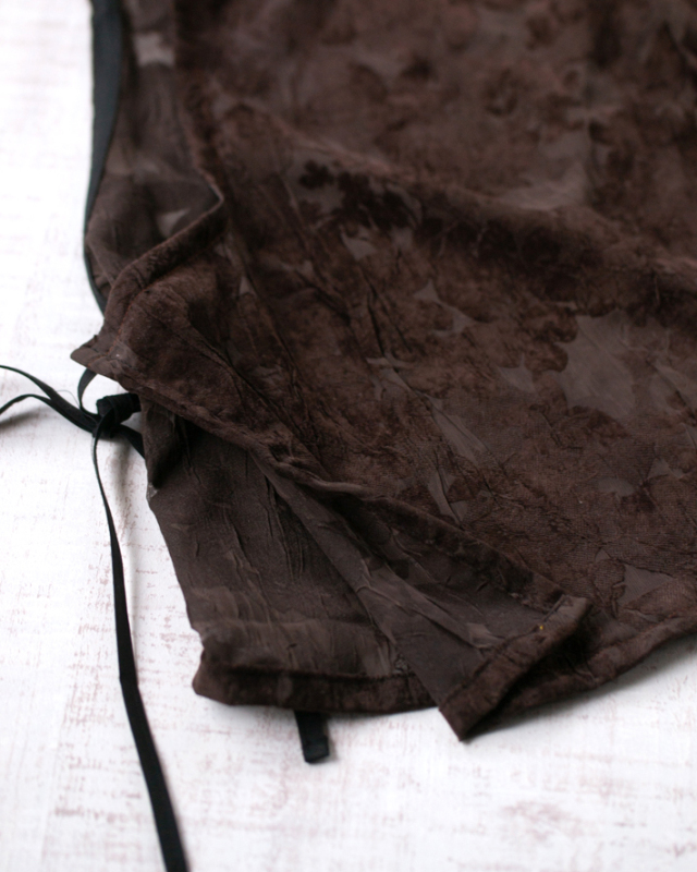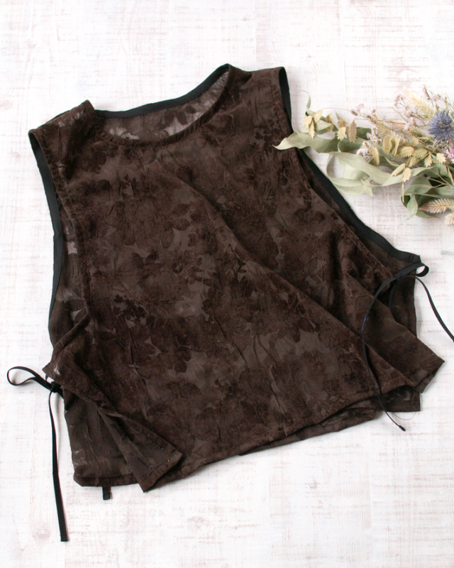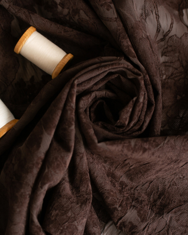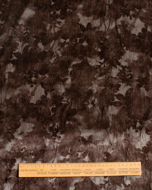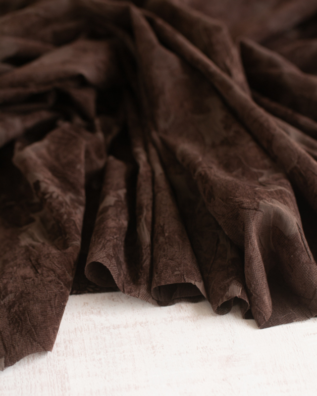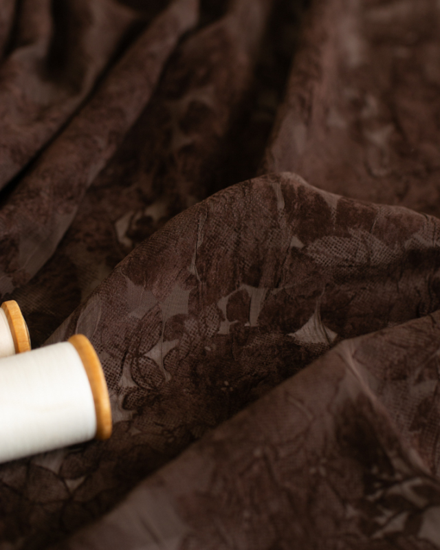 薄手でふんわり透け感のある生地に、大きめの花柄がプリントされた上品な一枚です。ほんのりシワ感があり、シンプルに仕立てても華やかに見えます。色はチョコレートのような深いブラウンです。