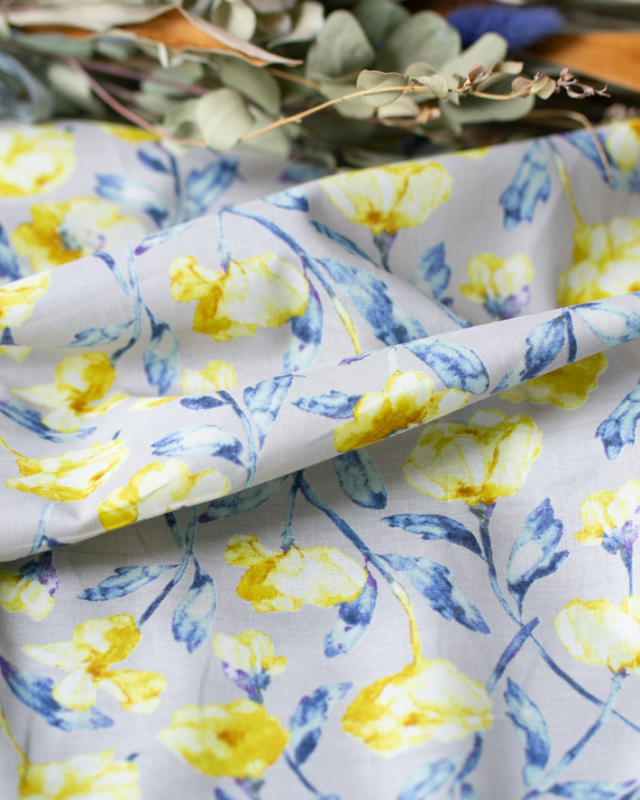 お色はグレーベースに黄色い花と