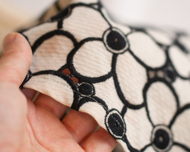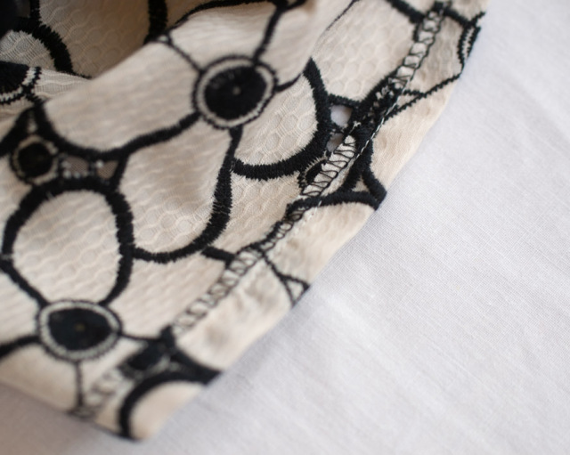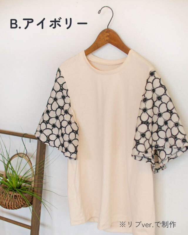 袖部分はベース生地が薄いベージュ、刺繍がブラックです。
