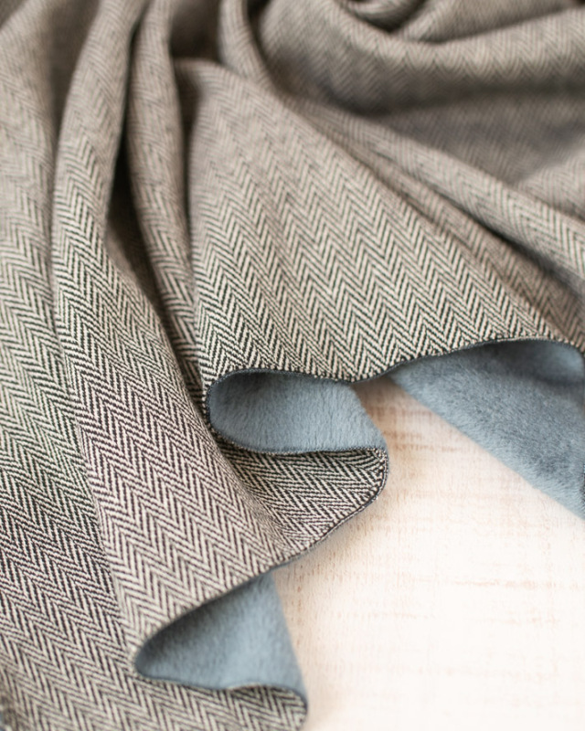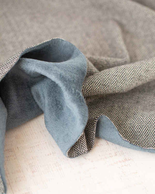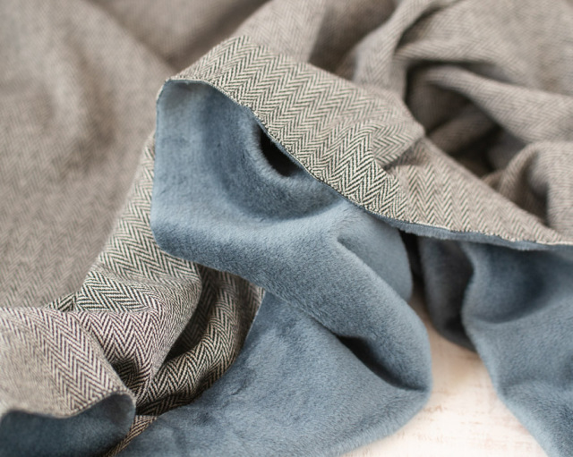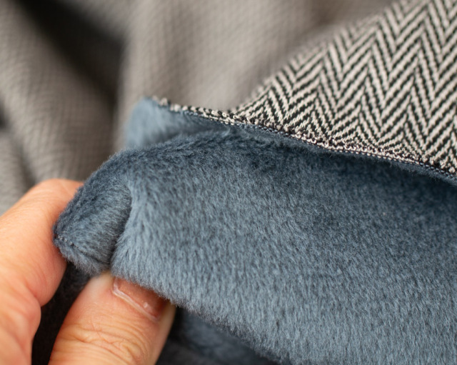 | 品名 | 【ニット】着る毛布ボンバーヒートツイード・ヘリンボーン柄(表ブラック×裏ホグブルー)オーダーカット |